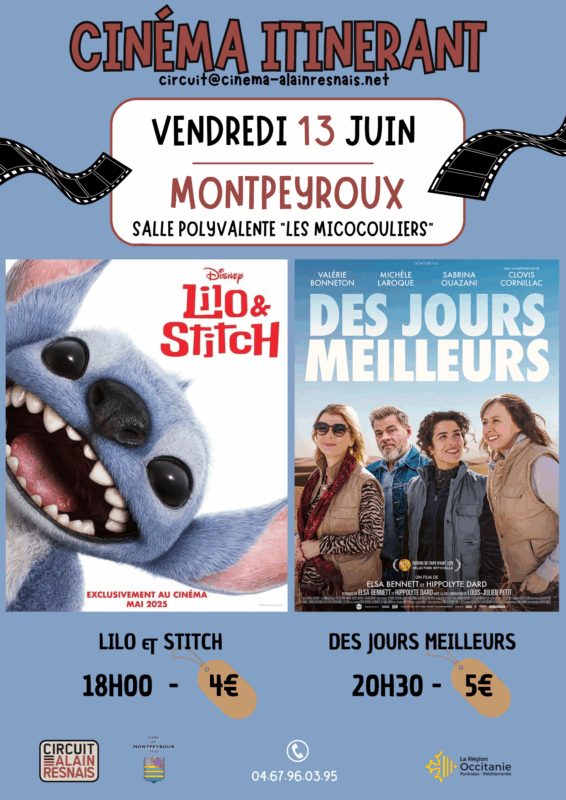 La municipalité de Montpeyroux vous propose, avec la collaboration du cinéma “Alain Resnais”, 2 séances de cinéma dans leur programme : “cinéma itinérant“, le vendredi 13 juin 2025 à la salle polyvalente (les Micocouliers).